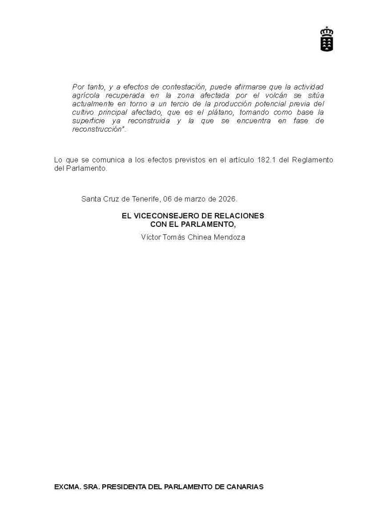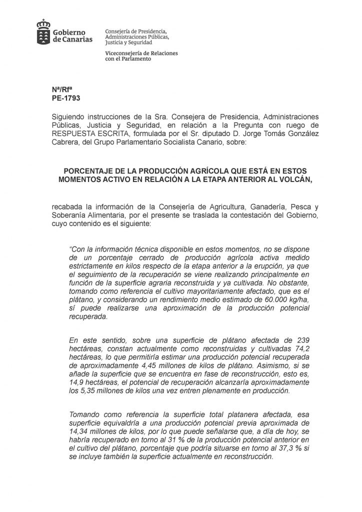La Consejería de Agricultura, Ganadería, Pesca y Soberanía Alimentaria del Gobierno de Canarias estima que “se habría recuperado en torno al 31 % de la producción potencial anterior en el cultivo del plátano” en la superficie afectada por la lava, según trasladó en respuesta a una pregunta formulada por escrito por el diputado Jorge González (PSOE), que se había interesado por esta cifra.