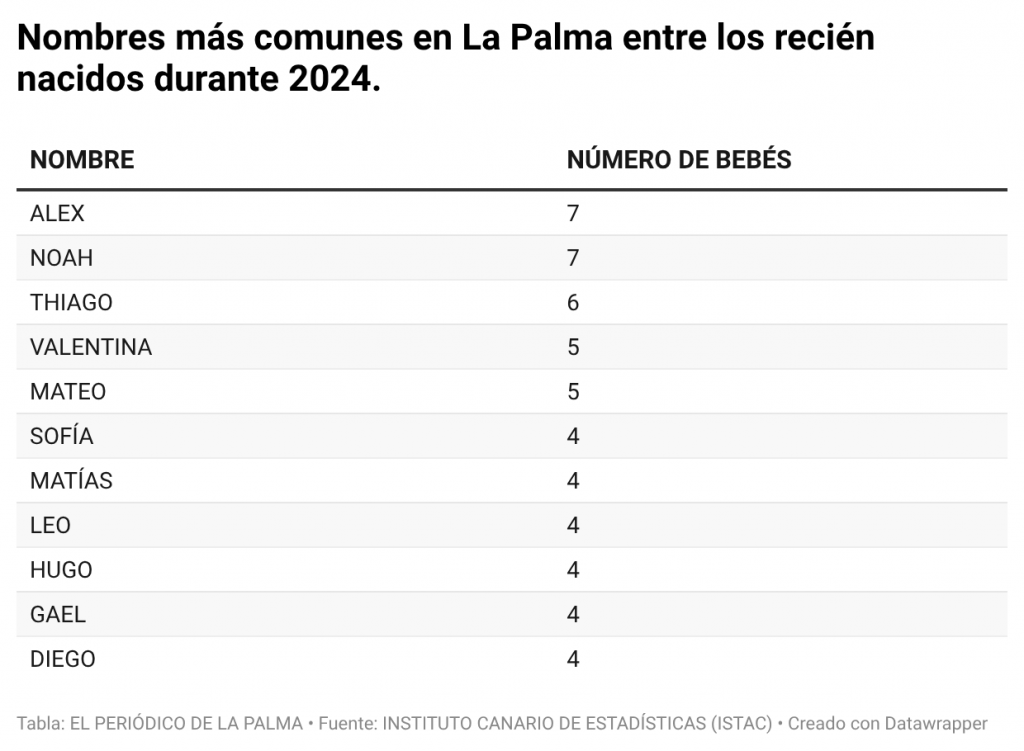 Alex, Noah y Valentina son los nombres más utilizados entre los recién nacidos en La Palma en 2024, según datos del Instituto Canario de Estadística (ISTAC). Un año antes, los más usados fueron Gael, Mateo y Valeria.