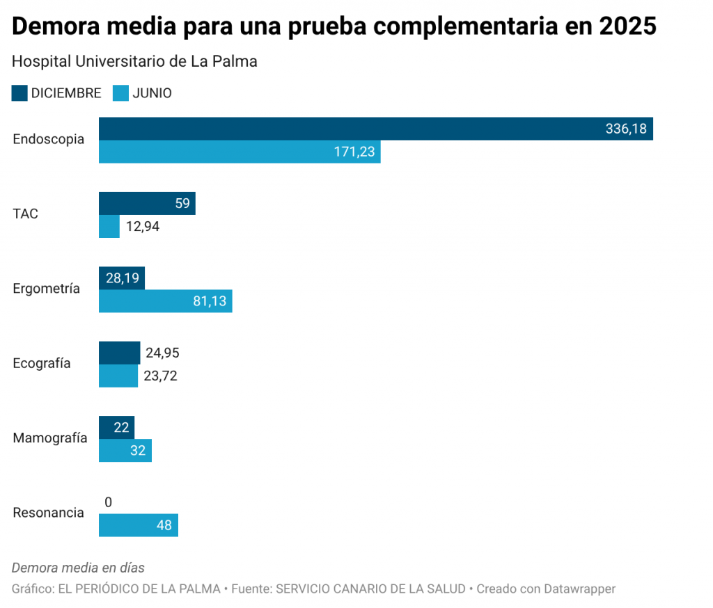 Al finalizar 2025, el tiempo medio de espera para una endoscopia en el Hospital Universitario de La Palma era de 336,2 días —casi un año—, lo que la convierte en la prueba complementaria con mayor demora en la isla, según los últimos datos publicados la semana pasada por el Servicio Canario de la Salud.