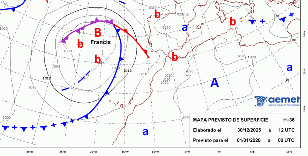 El paso de un frente frío asociado a la borrasca Francis ha llevado al Gobierno de Canarias, a través de la Dirección General de Emergencias, a declarar durante la madrugada del jueves 1 de enero la situación de “alerta por fenómenos costeros” en todo el archipiélago, así como la “alerta por lluvias y viento en Tenerife y La Palma” a partir de las 03:00 horas, según informa el Ejecutivo regional en un comunicado de prensa. Además, se ha decretado la “prealerta por estos eventos en el resto de islas” y se ha activado “la prealerta por tormentas en toda la comunidad autónoma”.