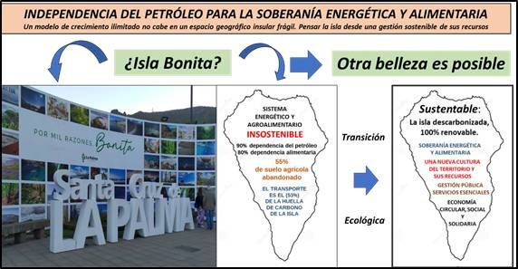 Los sistemas insulares pequeños como La Palma son extremadamente dependientes del exterior, donde los combustibles para el transporte, tanto aéreo como marítimo, constituyen la sangre que mueve todo el sistema insular, transporte interior y desde y hacia la isla que produce más del 50% de su huella de carbono, por lo tanto, somos uno de los territorios más vulnerables en las crisis energéticas porque nos afecta, también, directamente a nuestros bolsillos en el recibo de la luz, cuando repostamos con nuestros vehículos en las estaciones de servicio y cuando reponemos la despensa en un sistema agroalimentario muy dependiente de las importaciones. Todos los bolsillos quedan afectados por estás crisis energéticas mientras que las eléctricas y multinacionales petroleras multiplican sus beneficios.