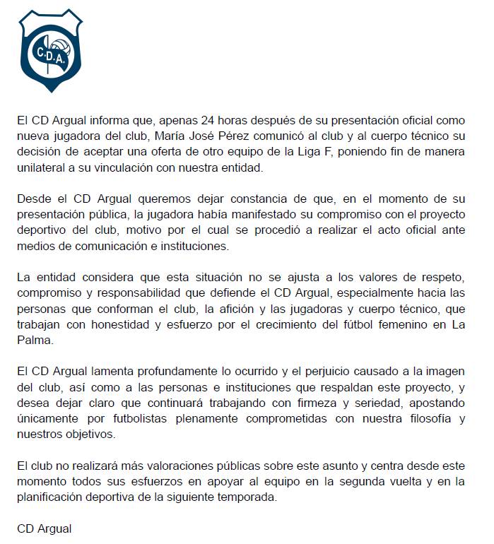El CD Argual, a través de un comunicado de prensa, informa de que la jugadora Mari José Pérez, histórica futbolista del Costa Adeje Tenerife y máxima goleadora histórica del club, les trasladó este jueves “su decisión de aceptar una oferta de otro equipo de la Liga F”, por lo que finaliza “de manera unilateral su vinculación con nuestra entidad”. El conjunto blanquiazul, que anunció el fichaje el pasado martes y procedió a su presentación el miércoles, sostiene que esta situación “no se ajusta a los valores de respeto, compromiso y responsabilidad que defiende el CD Argual”, por lo que “lamenta profundamente lo ocurrido y el perjuicio causado a la imagen del club, así como a las personas e instituciones que respaldan este proyecto”. El representante palmero en la Segunda Federación femenina anuncia que “no realizará más valoraciones públicas sobre este asunto”.