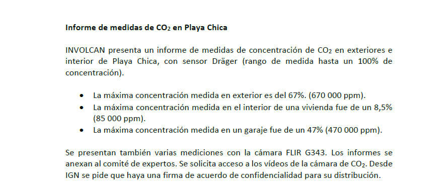 En la reunión del grupo de expertos del Plan Territorial Insular de Emergencias de Protección Civil (PEINPAL) del Cabildo de La Palma, celebrada el pasado 31 de julio, cuyo resumen fue publicado recientemente por la institución insular, se señala que Involcan presentó “un informe de medidas de concentración de CO₂ en exteriores e interior de Playa Chica, con sensor Dräger”.